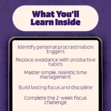 i used to think procrastination was a permanent part of who i was. every time i sat down to work, i’d find myself drifting toward distractions, whether it was my phone, cleaning, or just staring out the window. what this guide gave me was more than tips—it gave me perspective. instead of making me feel guilty, it helped me understand the root causes behind why i avoid tasks. the best part was how approachable the strategies felt. i didn’t need to adopt a brand new lifestyle, i just needed to take one small step at a time. the exercise on identifying my most common triggers was eye-opening. i realized i wasn’t lazy, i was just overwhelmed by tasks that felt too big. breaking them down into smaller steps instantly made them manageable. i also loved the section on time blocking—it helped me carve out space for both focus and rest, which actually kept me consistent. after a few weeks of applying these ideas, i’ve seen real changes. my to-do list no longer haunts me, my evenings feel calmer, and i have more confidence in myself. i’m not perfect, but now i’m finally making steady progress, and that feels incredible