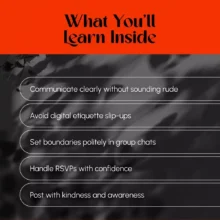 Unlike long or outdated etiquette manuals, the Modern Etiquette Micro-Course gives you fast, modern solutions to real-life digital dilemmas. With clear examples and real-world scenarios, it’s not about being perfect—it’s about being thoughtful and aware.