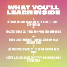 This bundle is truly a game changer! It's a great mix of resources that come together to create a well-rounded approach to tackling anxiety. The positivity plan, in particular, is a standout. It really dives deep into why simply thinking positive doesn’t always cut it and offers clear, actionable steps to shift your mindset. Reframing your thoughts has never been so accessible, and the exercises provided make the process feel manageable rather than overwhelming. What I love most about this set is how user-friendly everything is. It’s not just theory – there are practical tools like checklists and course outlines that help guide you every step of the way. Whether you're new to mindfulness or have been practicing for a while, there’s something valuable here for everyone