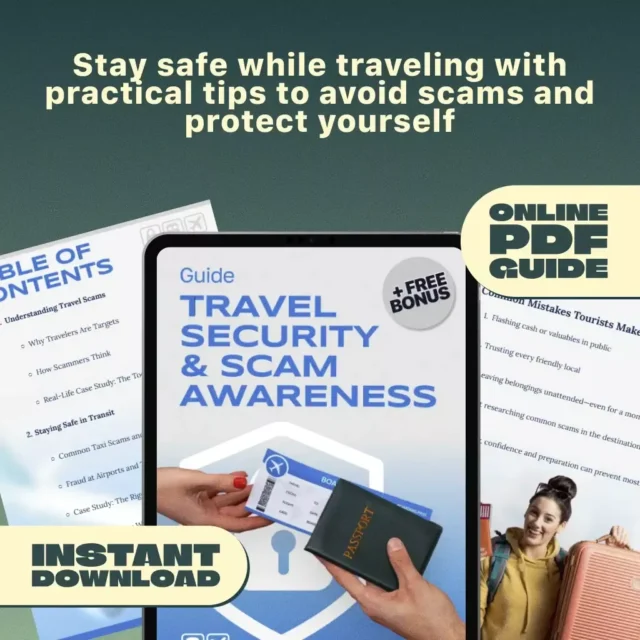 When you’re exploring a new destination, the last thing you want is to fall victim to a scam or unsafe situation. The Travel Security & Scam Awareness Guide is your essential companion for traveling with confidence. This easy-to-read digital guide is packed with real-world examples, proven safety strategies, and quick prompts you can use on the go—helping you enjoy your trip without unnecessary risks. Whether you’re a first-time traveler or a seasoned globetrotter, this guide gives you the tools to protect yourself, your belongings, and your peace of mind.